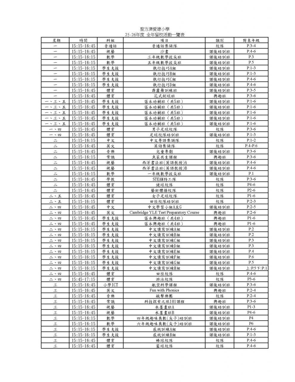 課後活動時間表