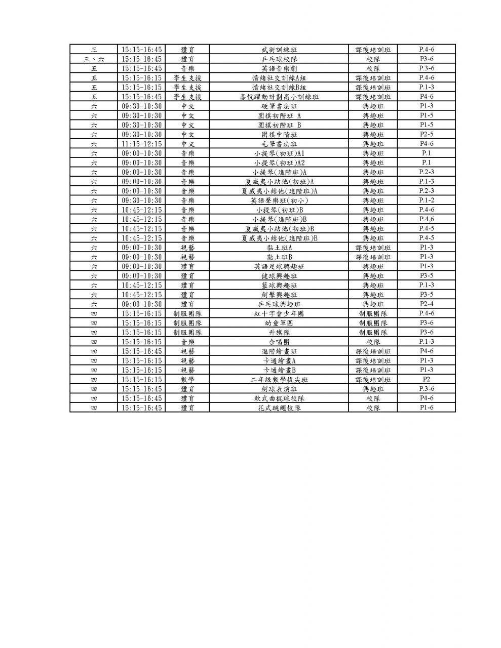 課後活動時間表