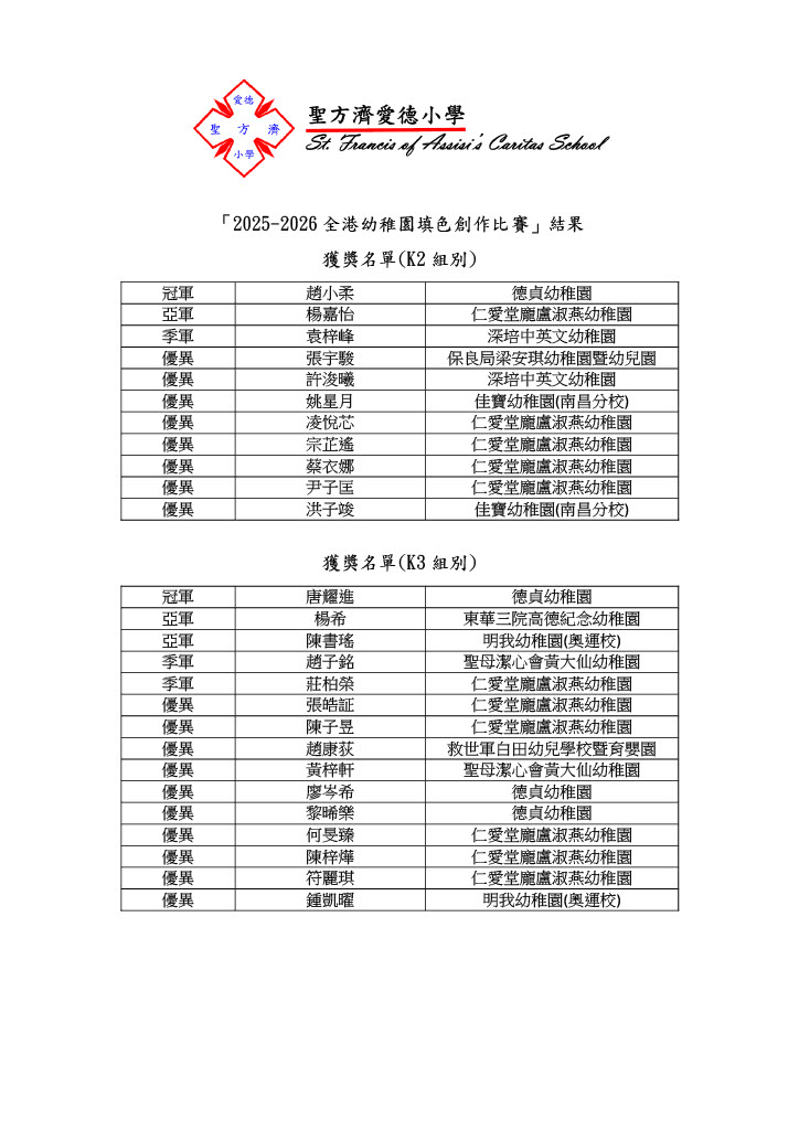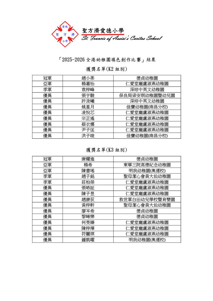 「2025-2026全港幼稚園填色創作比賽」獲獎名單